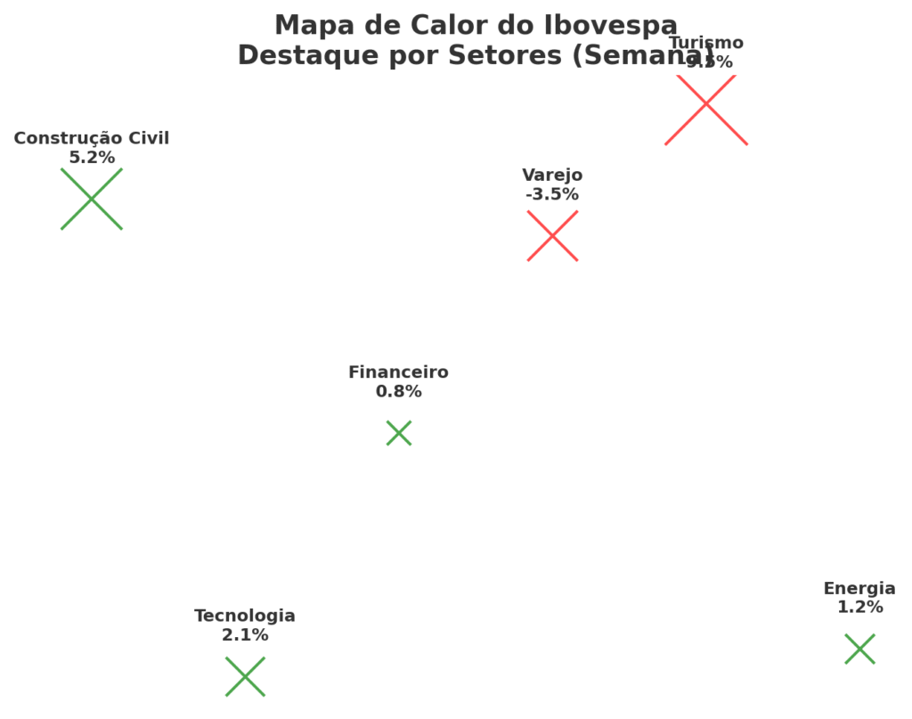 📊 Mapa de calor do Ibovespa (descrição): setores de construção civil em verde, varejo e turismo em vermelho, mostrando dispersão de retornos.