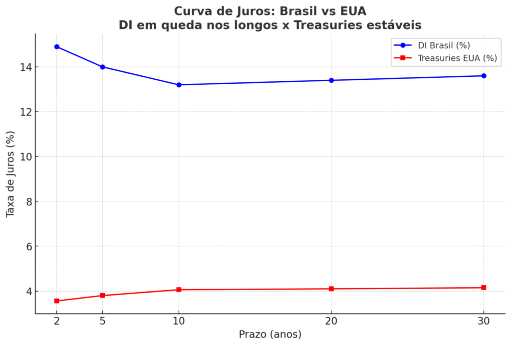 Essa inversão parcial reforça a percepção de que o mercado projeta cortes de juros, mas ainda teme persistência inflacionária no curto prazo.
